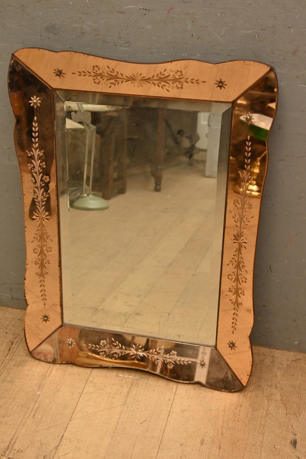 A FRENCH WALL MIRROR WITH PEACH MIRROR EDGING AND ENGRAVED STAR PATTERNING (75H X 56W CM) (LEONARD JOEL DELIVERY SIZE: LARGE)