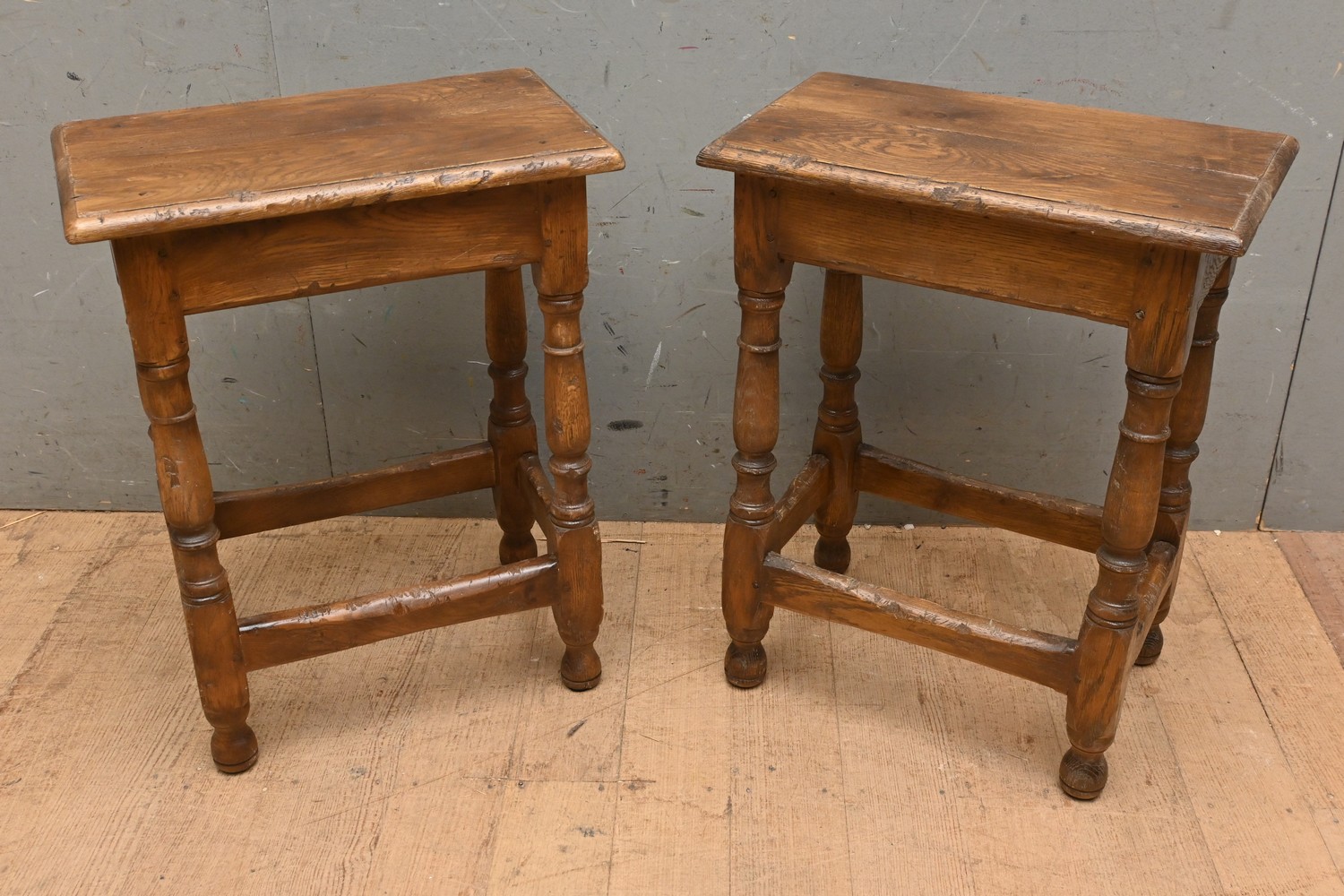 A PAR OF ENGLISH CHARLES II STYLE OAK JOINT STOOLS (58H X 47W X 27D CM) (LEONARD JOEL DELIVERY SIZE: LARGE)
