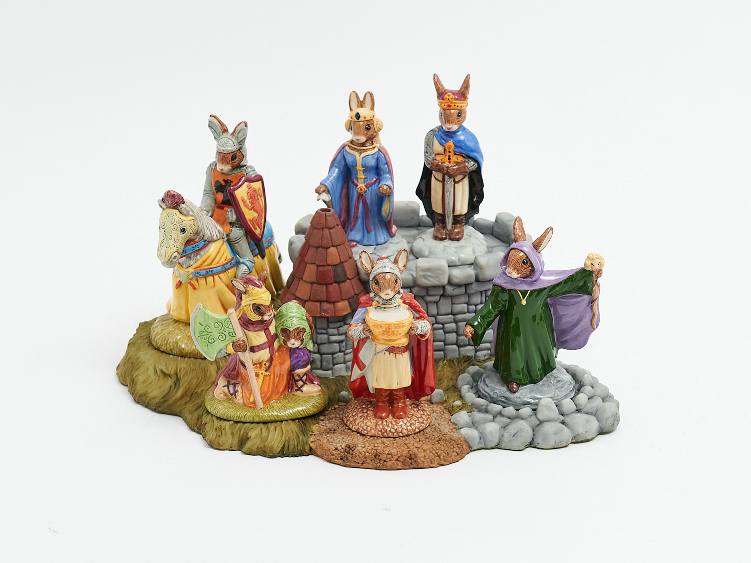 ROYAL DOULTON BUNNYKINS "TUDOR" COLLECTION COMPRISING SEVEN FIGURES AND DISPLAY BASE W.31CM, LEONARD JOEL LOCAL DELIVERY: SMALL