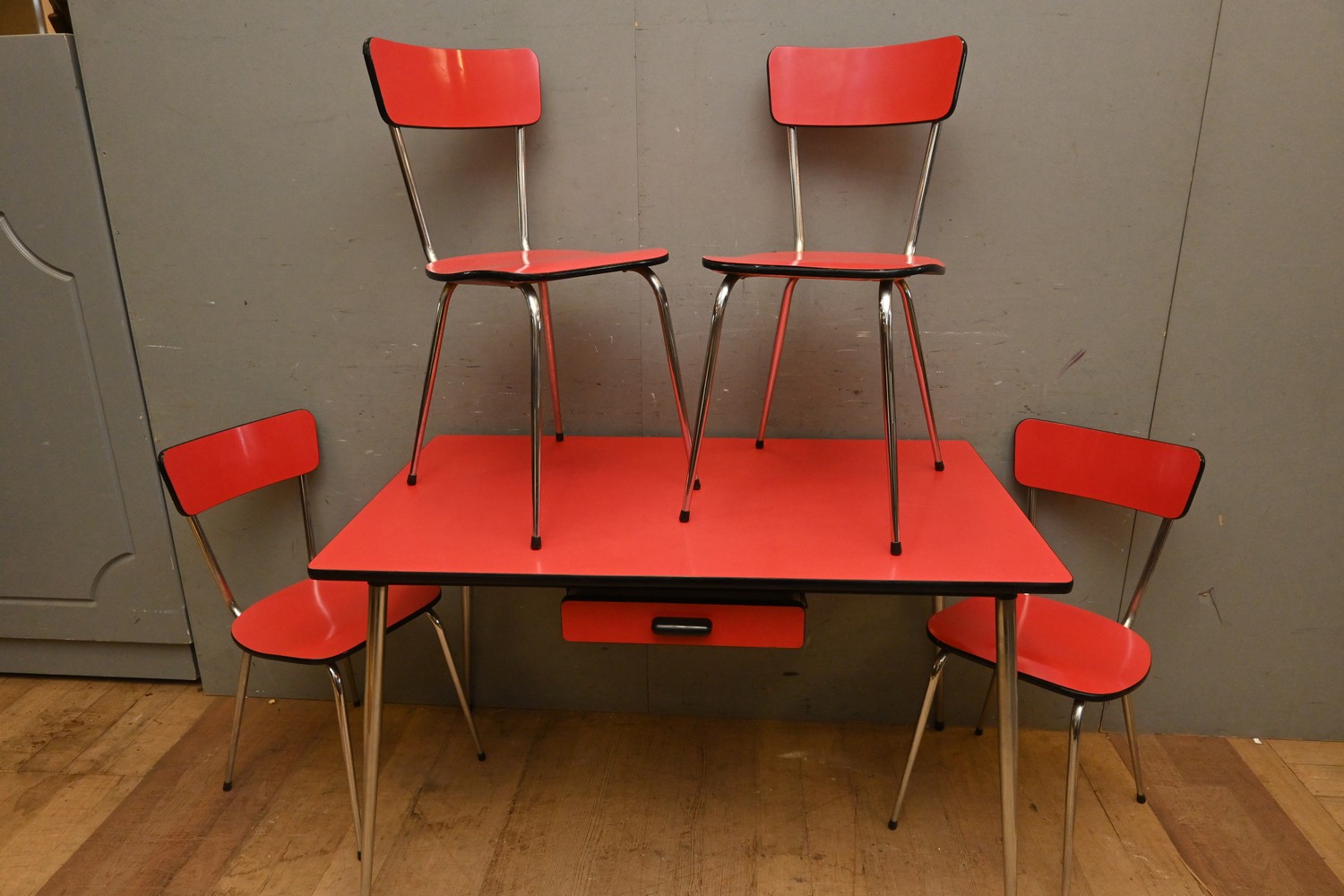 A 1960'S CHROME AND LAMINEX FIVE PIECE DINING SETTING WITH SINGULAR DRAWER (A/F) ( 75H X 120W X 69D CM) (LEONARD JOEL DELIVERY SIZE: X-LARGE)
