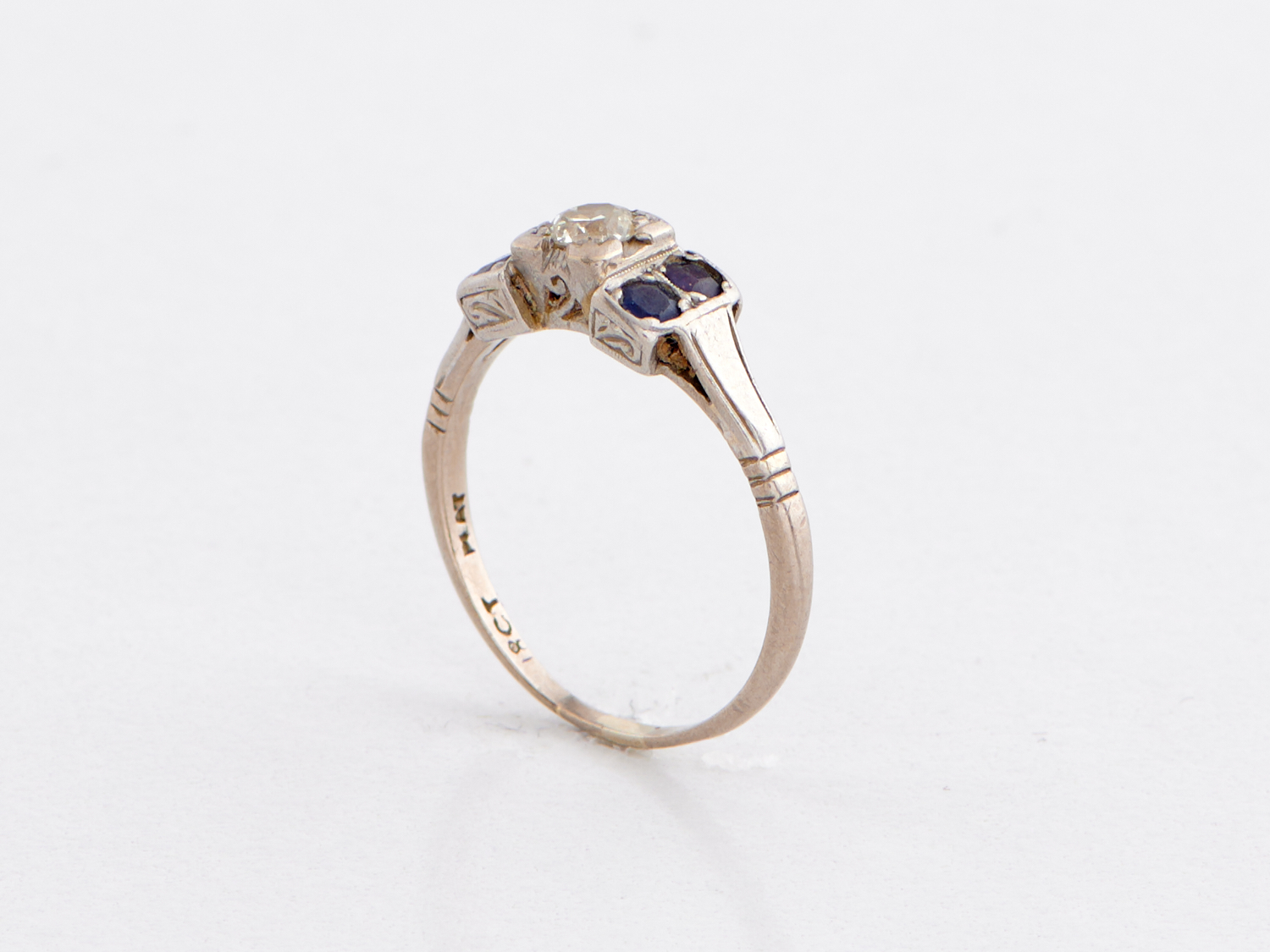 A DIAMOND AND SAPPHIRE RING IN 18CT WHITE GOLD AND PLATINUM, THE DIAMOND WEIGHING APPROXIMATELY 0.30CTS (MEASURED IN SETTING) RING SIZE O, WEIGHT 3.3GMS