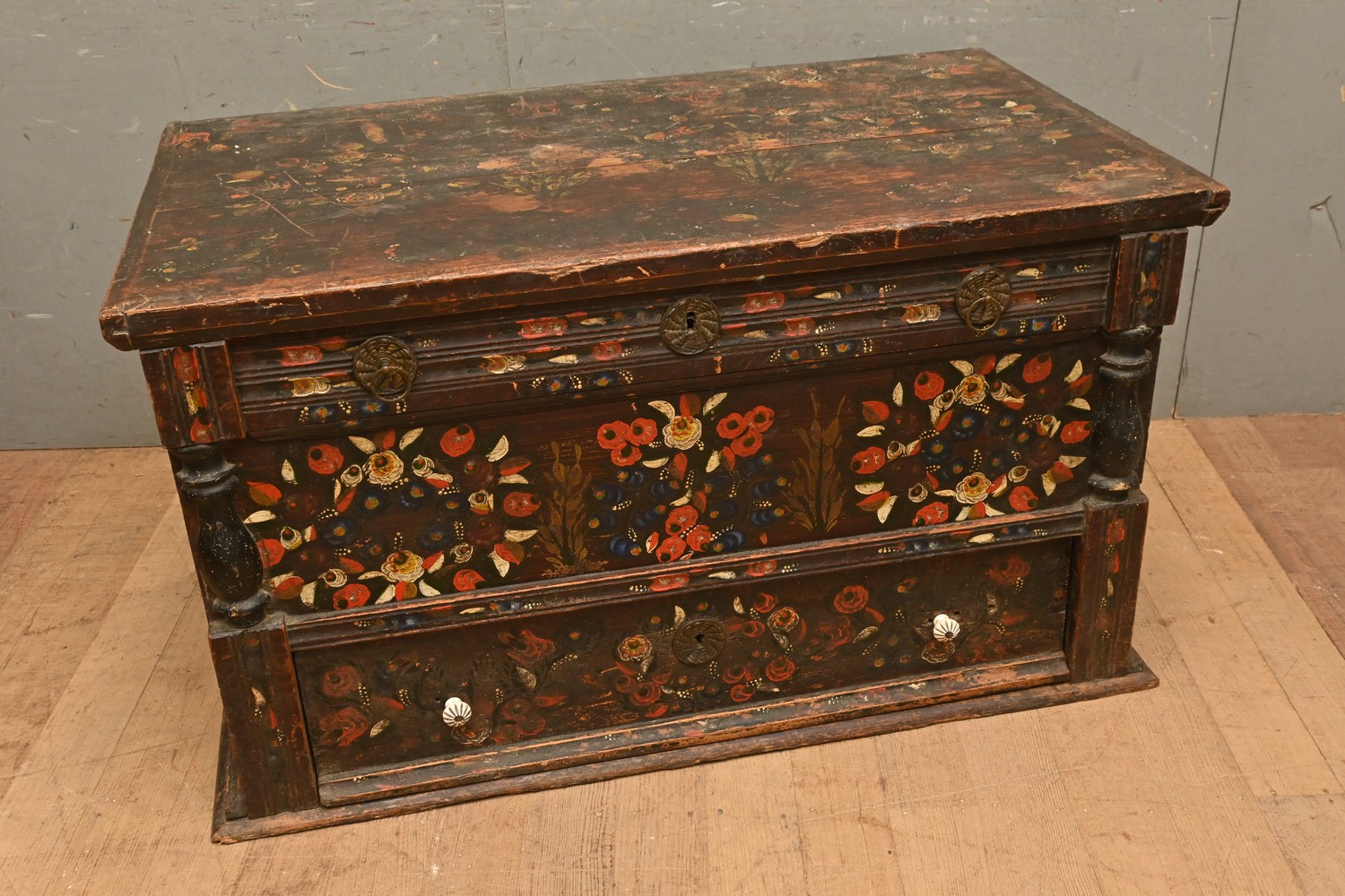 A MID-19th CENTURY DUTCH FOLK-PAINTED PINE CHEST (A/F) ( 67H X 118W X 70D CM) (THIS HEAVY ITEM MUST BE REMOVED BY CLIENTS OR CARRIERS AT THE CUSTOMERS EXPENSE. LEONARD JOEL STAFF CANNOT ASSIST CARRYING THIS ITEM)