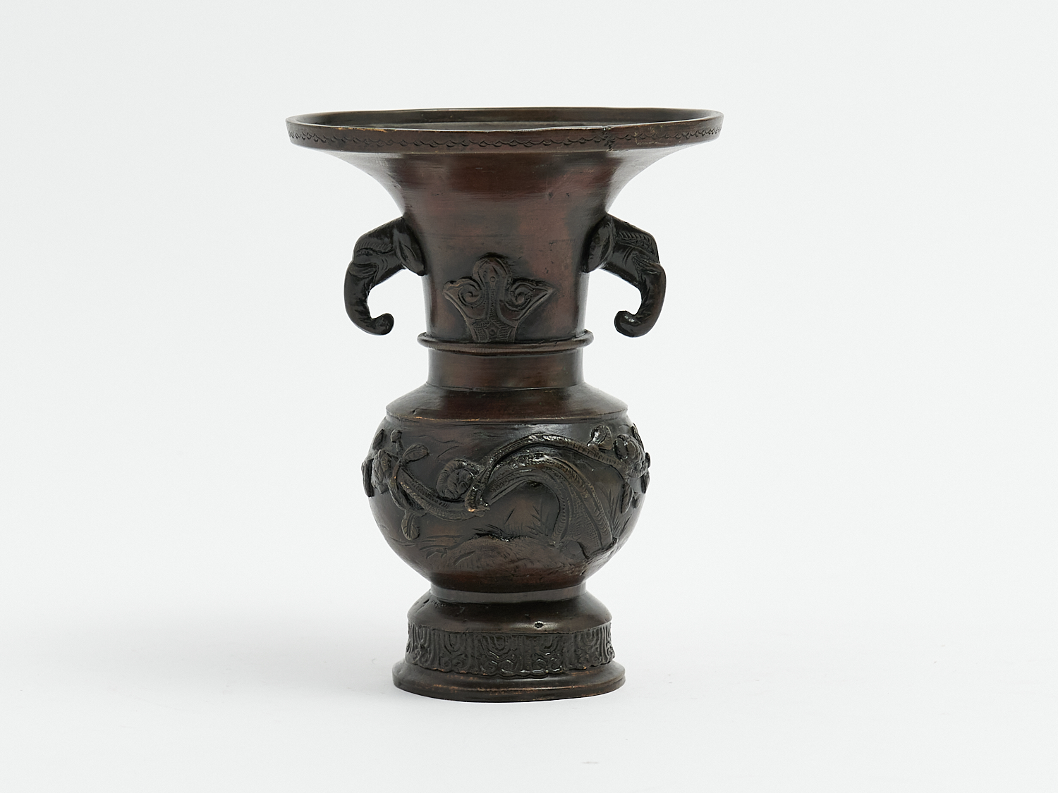 A JAPANESE BRONZE URN WITH ELEPHANT HANDLES H.18.5CM, LEONARD JOEL HOME DELIVERY SIZE: SMALL