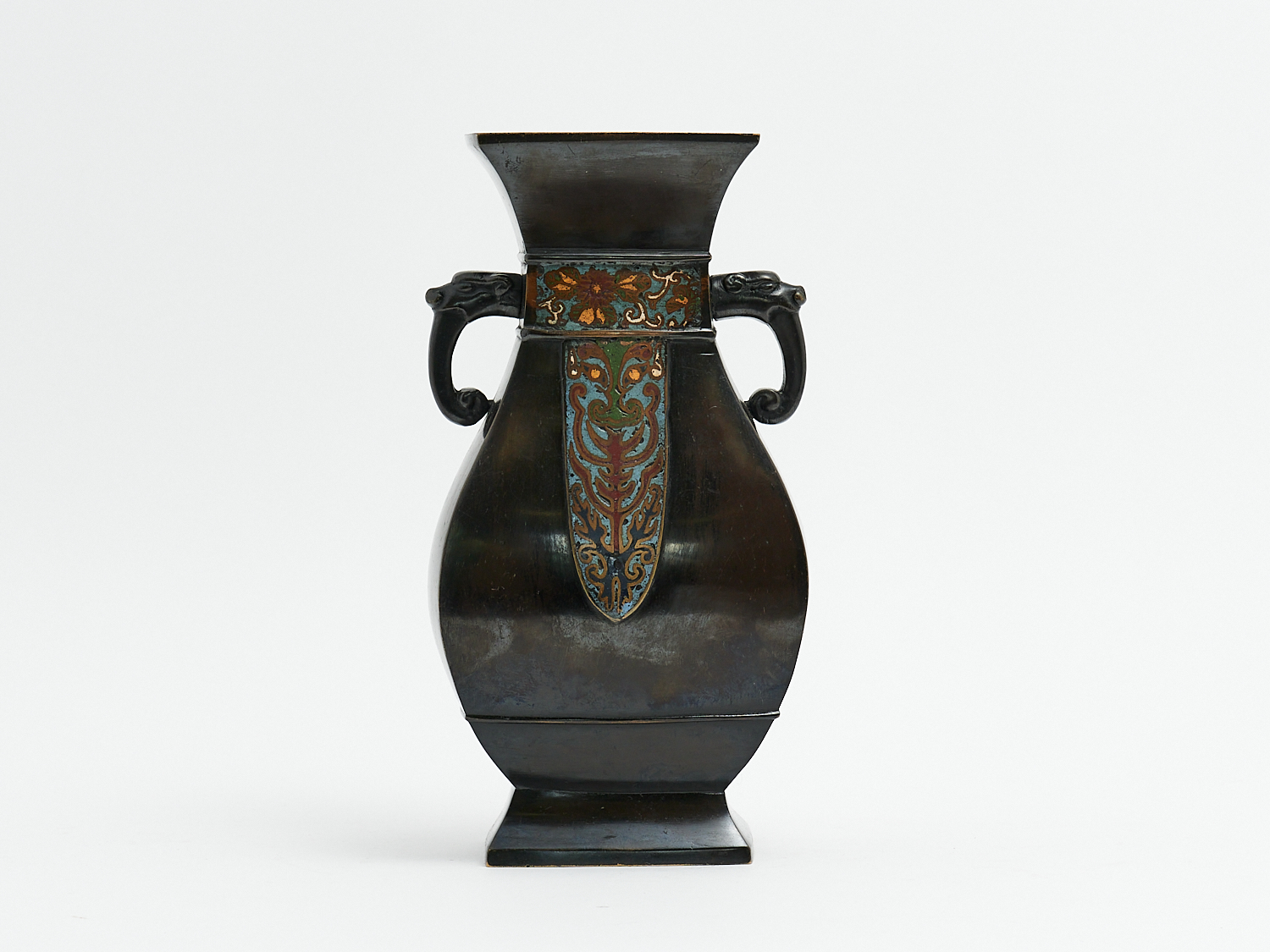 A JAPANESE TWO HANDLED BRONZE VASE WITH CHAMPLEVE FRIEZE H.29.5CM, LEONARD JOEL HOME DELIVERY SIZE: SMALL