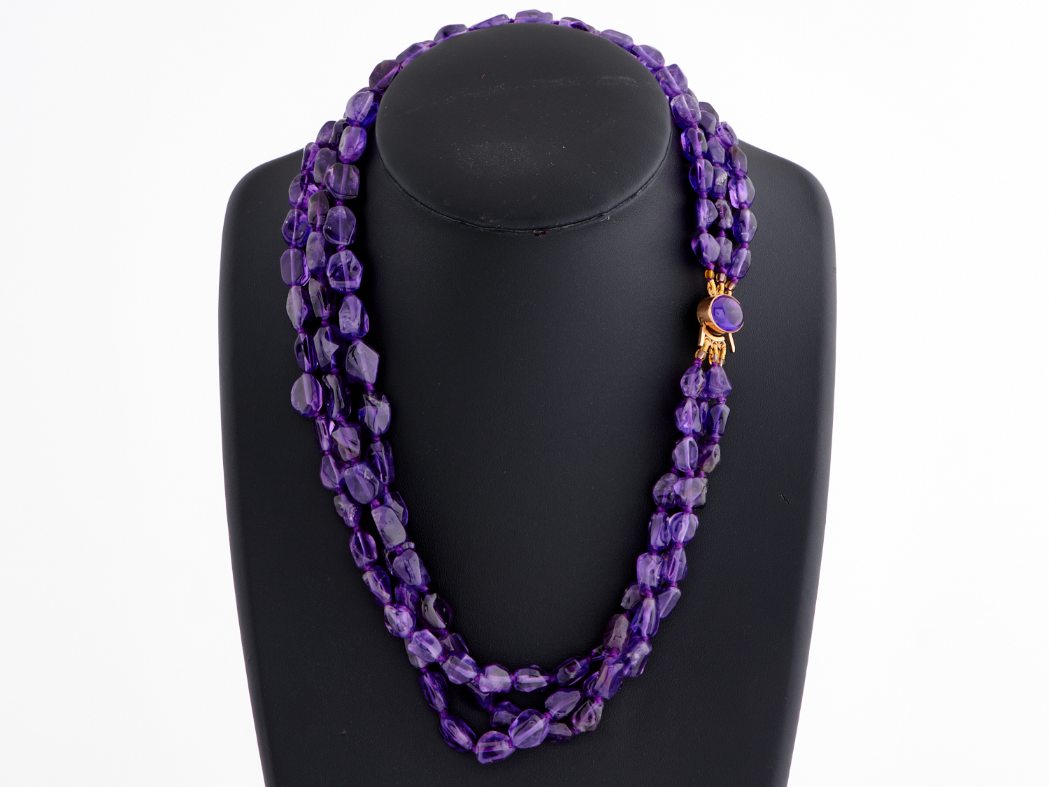 A TRIPLE STRAND AMETHYST BEAD NECKLACE, TO A CABOCHON AMETHYST SET CLASP IN 9CT GOLD, LENGTH 530MM