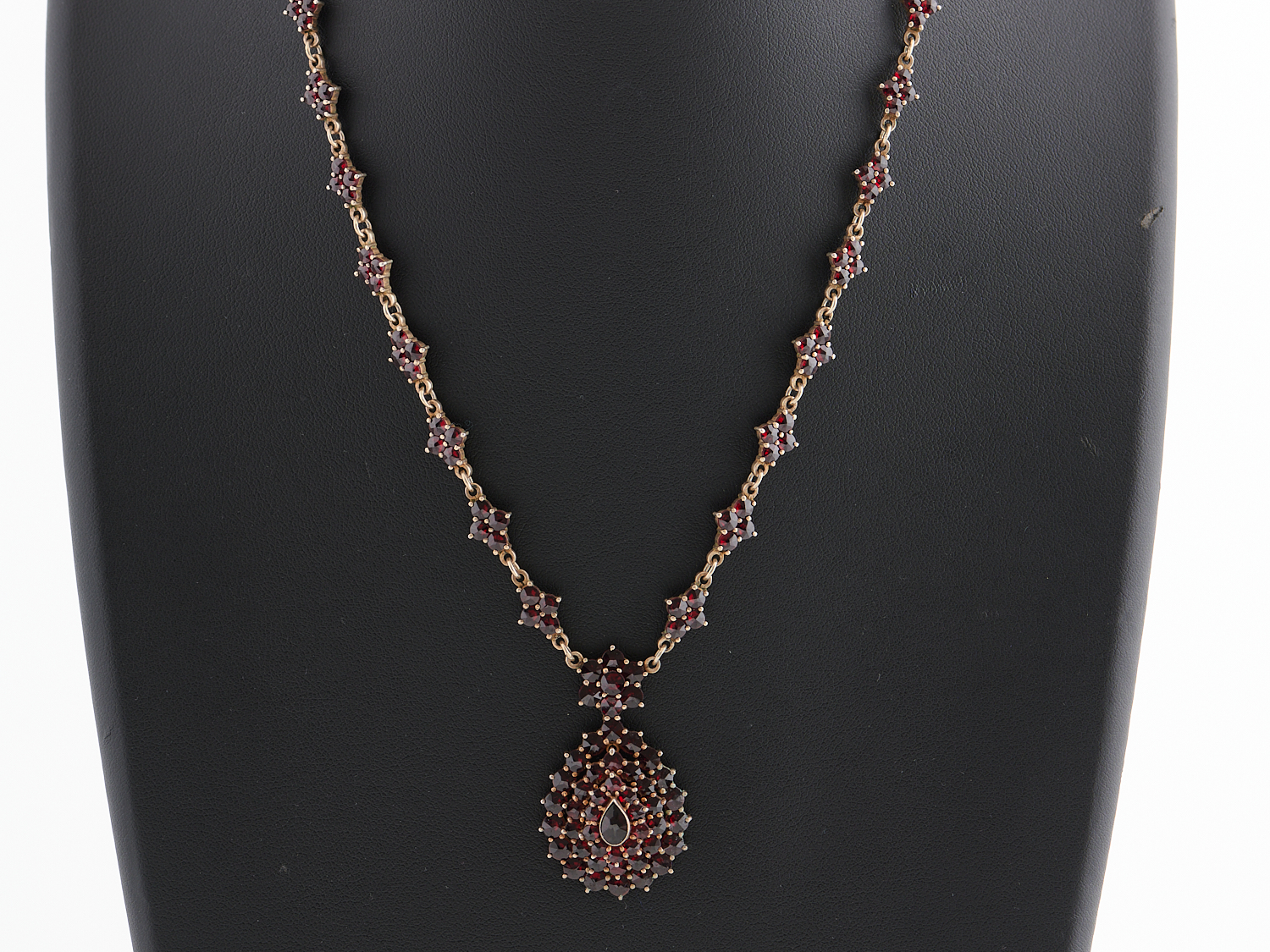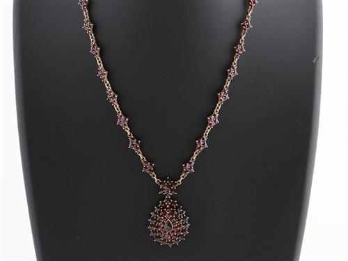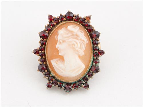 A GARNET NECKLACE, LENGTH 430MM, AND CAMEO BROOCH, 27 X 22MM, ALL IN LOW CARAT GOLD