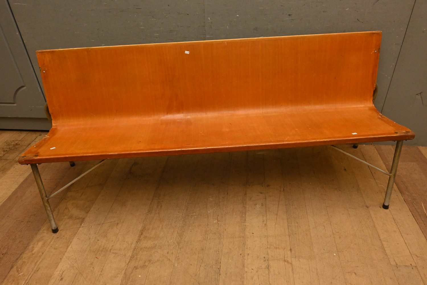 A MID CENTURY INDUSTRIAL THREE SEATER PLYWOOD BENCH (A/F) ( 80H X 184W X 54D CM) (LEONARD JOEL DELIVERY SIZE: X-LARGE)