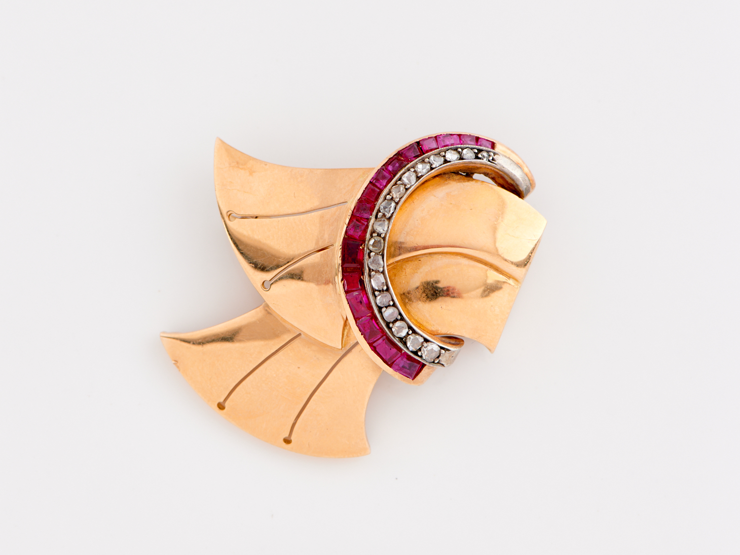 A RETRO SYNTHETIC RUBY AND DIAMOND RIBBON BROOCH IN 18CT GOLD, 40 X 40MM, WEIGHT 15.5GMS