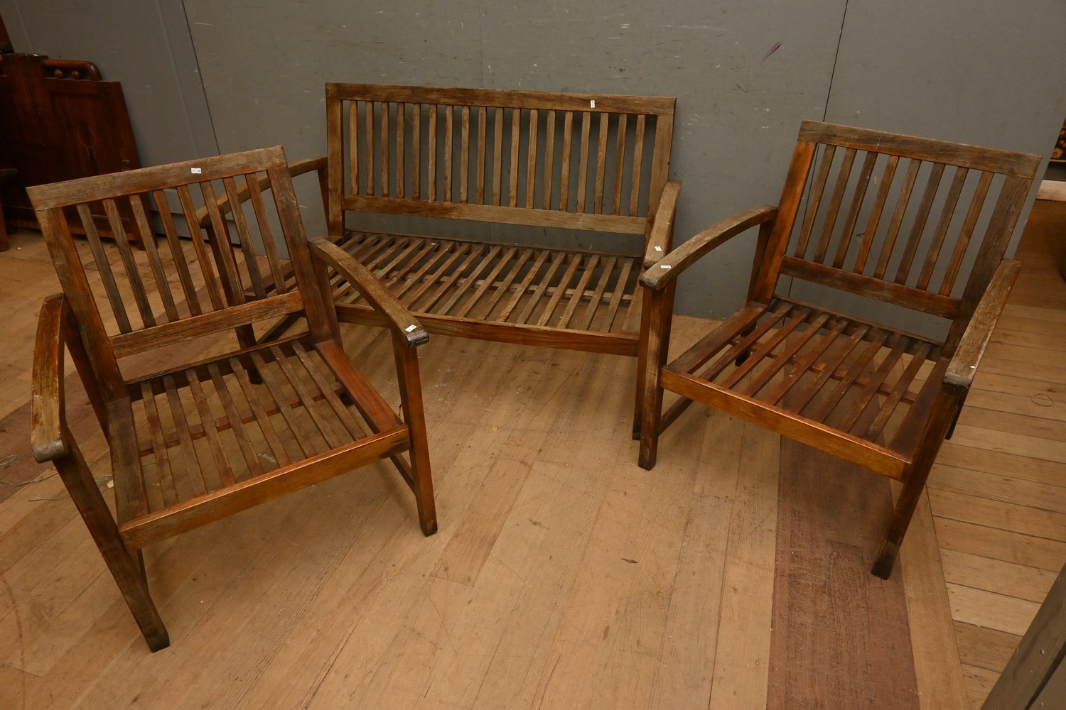 A THREE PIECE TEAK OUTDOOR SETTING ( A/F) ( 78H X 129W X 79D CM) (LEONARD JOEL DELIVERY SIZE: LARGE)