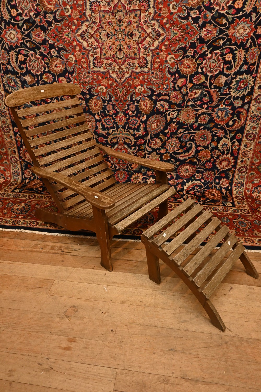 A TEAK ARMCHAIR AND STOOL (A/F) ( 95H X 62W X 96D CM) (LEONARD JOEL DELIVERY SIZE: LARGE)