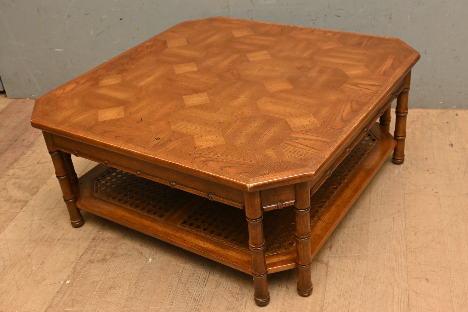 A FRENCH STYLE TWO TIER TIMBER & RATTAN COFFEE TABLE (A/F) ( 42H X 97W X 97D CM) (LEONARD JOEL DELIVERY SIZE: X-LARGE)