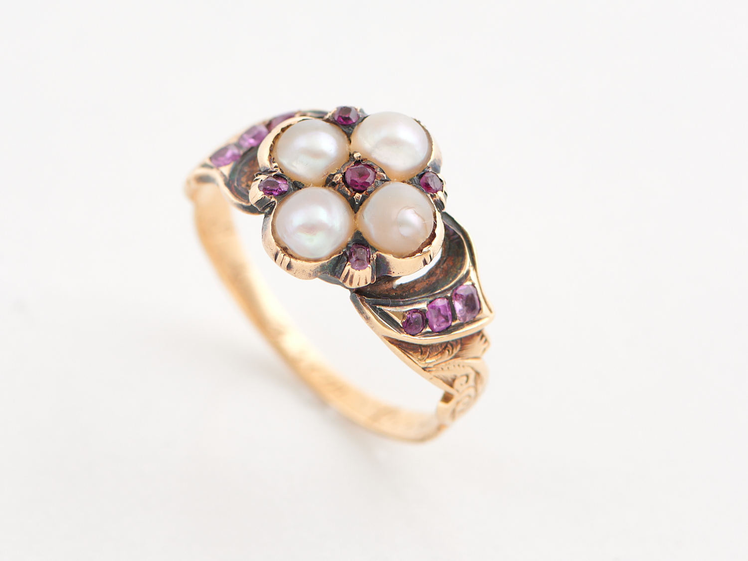 AN ANTIQUE PEARL AND RUBY CLUSTER RING IN 18CT GOLD, RING SIZE L, WEIGHT 2.3GMS