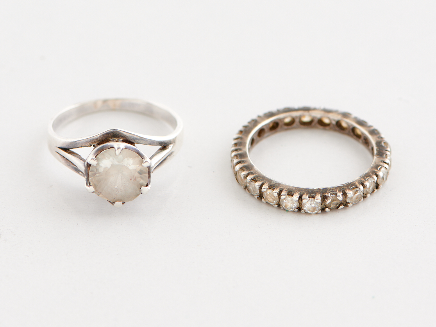 A PASTE SET ETERNITY RING AND WHITE SAPPHIRE SET SOLITAIRE RING IN STERLING SILVER, RING SIZE J AND K