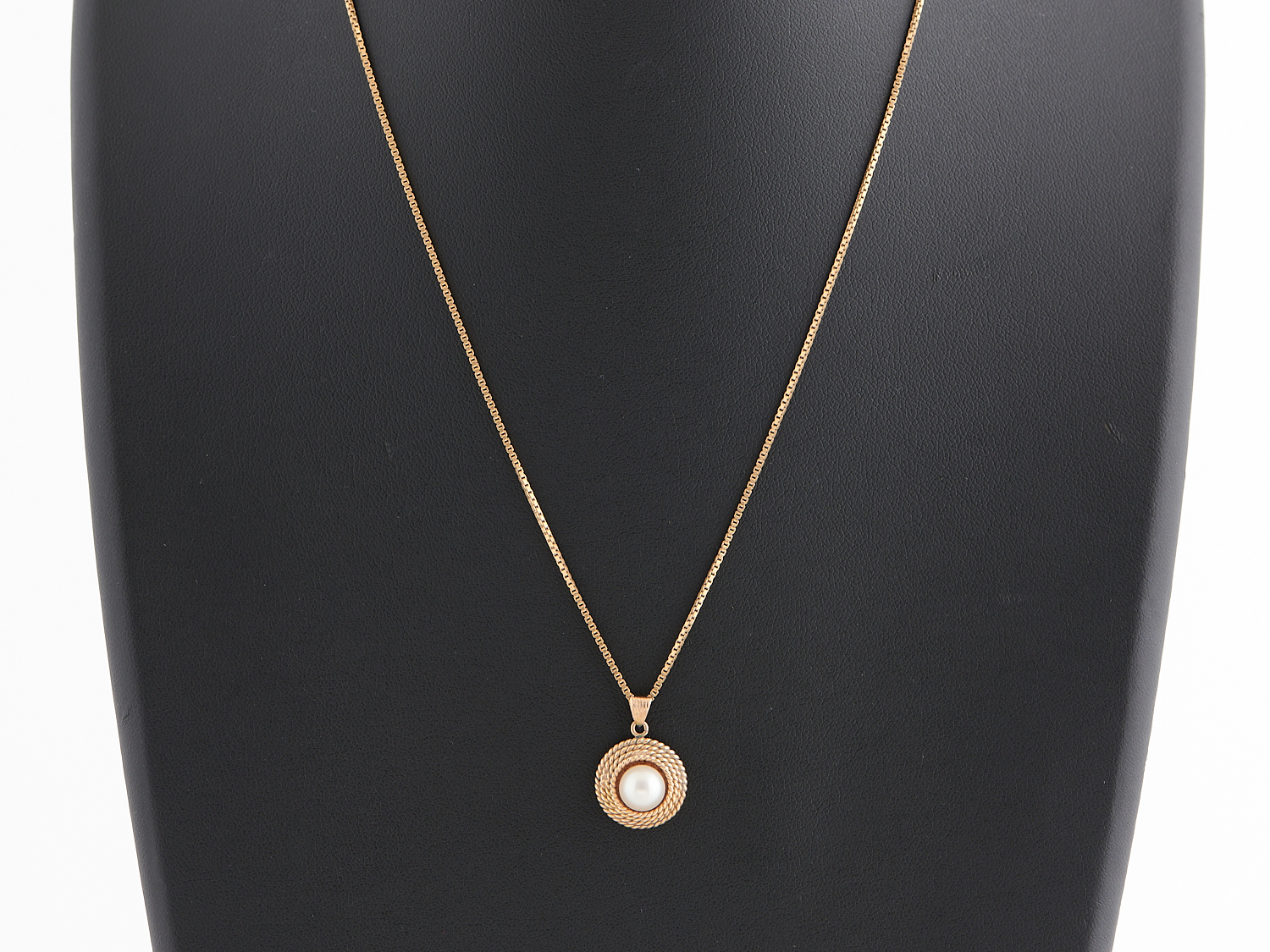 A PEARL SET PENDANT IN 14CT GOLD (2.3GMS), TO AN ITALIAN CHAIN IN 18CT GOLD (3.7GMS), ALONG WITH A CORAL AND PEARL RING IN 14CT GOLD (4.3GMS), RING SIZE J/K