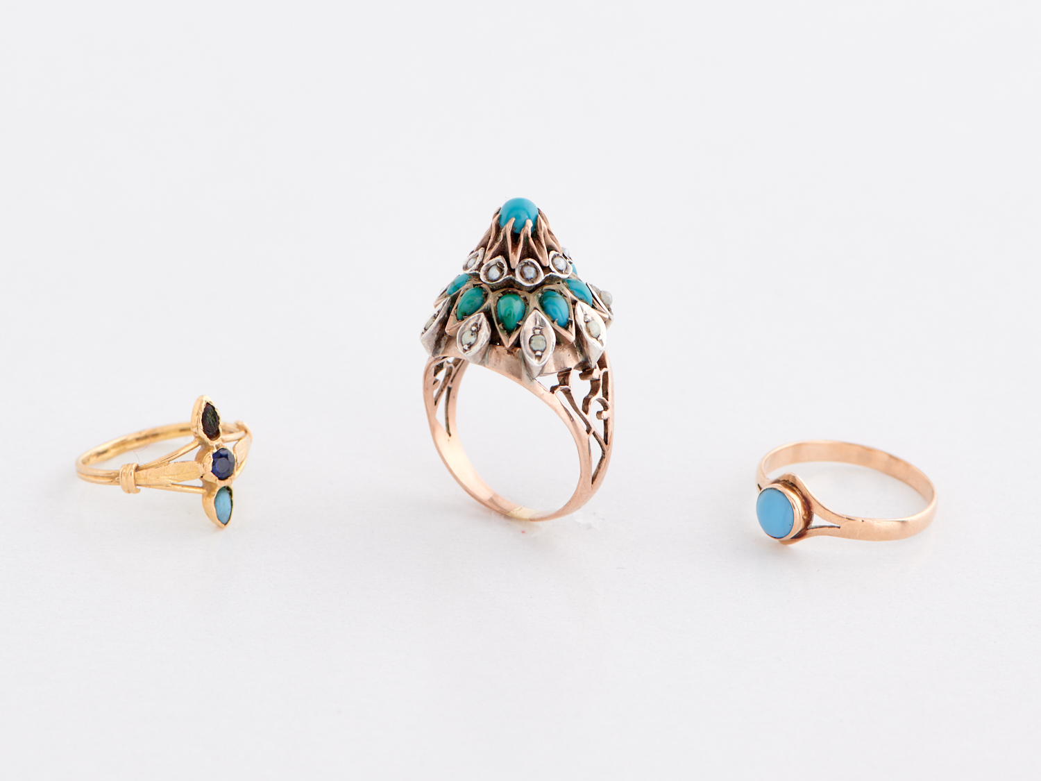 THREE TURQUOISE AND GEM SET RINGS, INCLUDING A TURQUOISE AND SAPPHIRE SET RING IN 18CT GOLD, RING SIZE F/G, 1.3GMS, SEED PEARL AND TURQUOISE RING IN 9CT GOLD AND SILVER, RING SIZE M, 6.4GMS, AND A SINGLE TURQUOISE SET RING IN 12CT GOLD, RING SIZE I, 0.9GMS