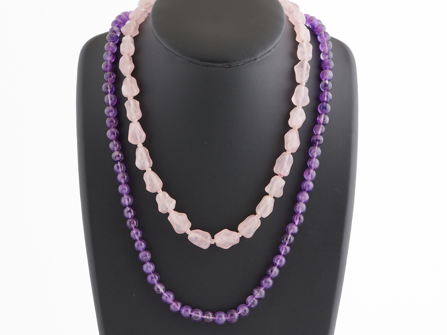 AN AMETHYST BEAD (LENGTH 800MM) AND ROSE QUARTZ BEAD (LENGTH 670MM) NECKLACE