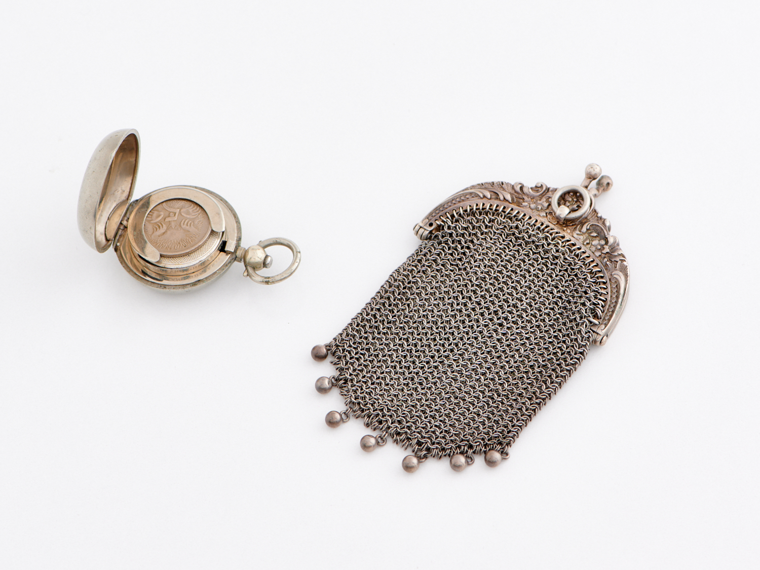 A MESH PURSE PENDANT IN STERLING SILVER ALONG WITH AN ENGRAVED SOVEREIGN CASE IN STERLING SILVER