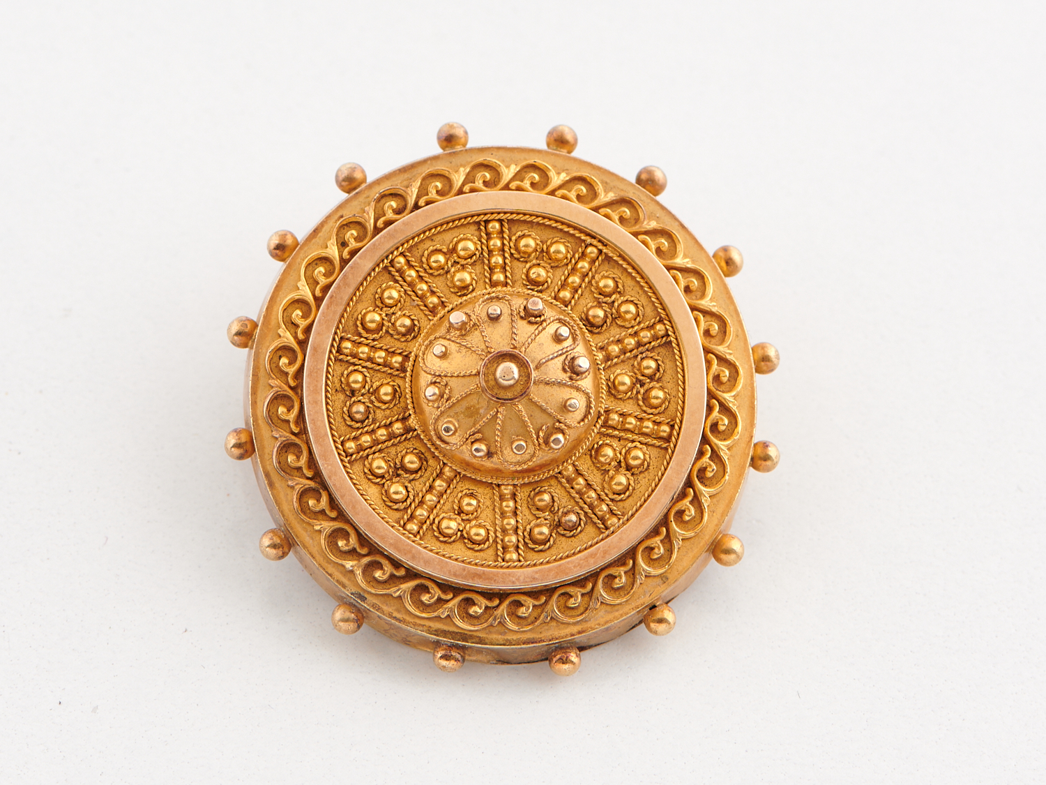 A GOLD FILIGREE TARGET BROOCH, FRONT IN 18CT GOLD, BACK IN 10CT GOLD, DIAMETER 30MM, WEIGHT 12.8GMS