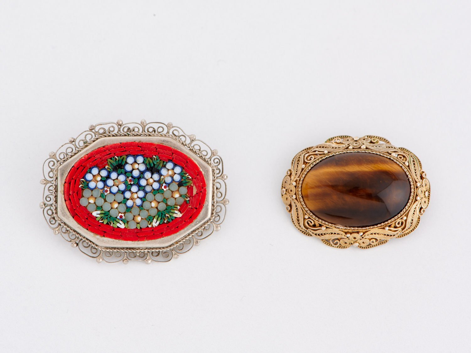 A MICROMOSAIC BROOCH IN SILVER TONE METAL, ALONG WITH A TIGERS EYE BROOCH IN GOLD PLATED STERLING SILVER