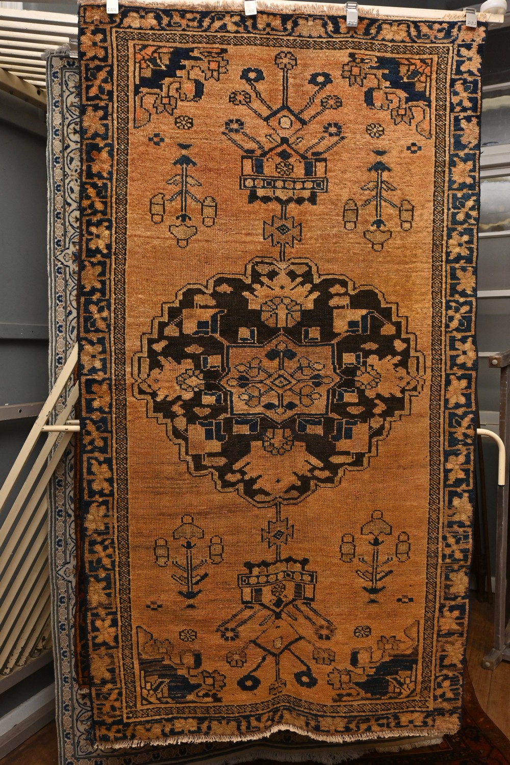 A VINTAGE TRIBAL PERSIAN LURI RUG. 100% WOOL. VINTAGE PILE. HAND-KNOTTED TRIBAL WEAVE WITH DESIGN OF CENTRAL ANCHORED MEDALLION ON A SOFT TAN FIELD OF TREE OF LIFE AND TRIBAL MOTIFS. SIZE: 217 X 115 CM ORIGIN: PERSIA - RRP: $1,900 DOCUMENTATION OF AUTHENTICITY INCLUDED.