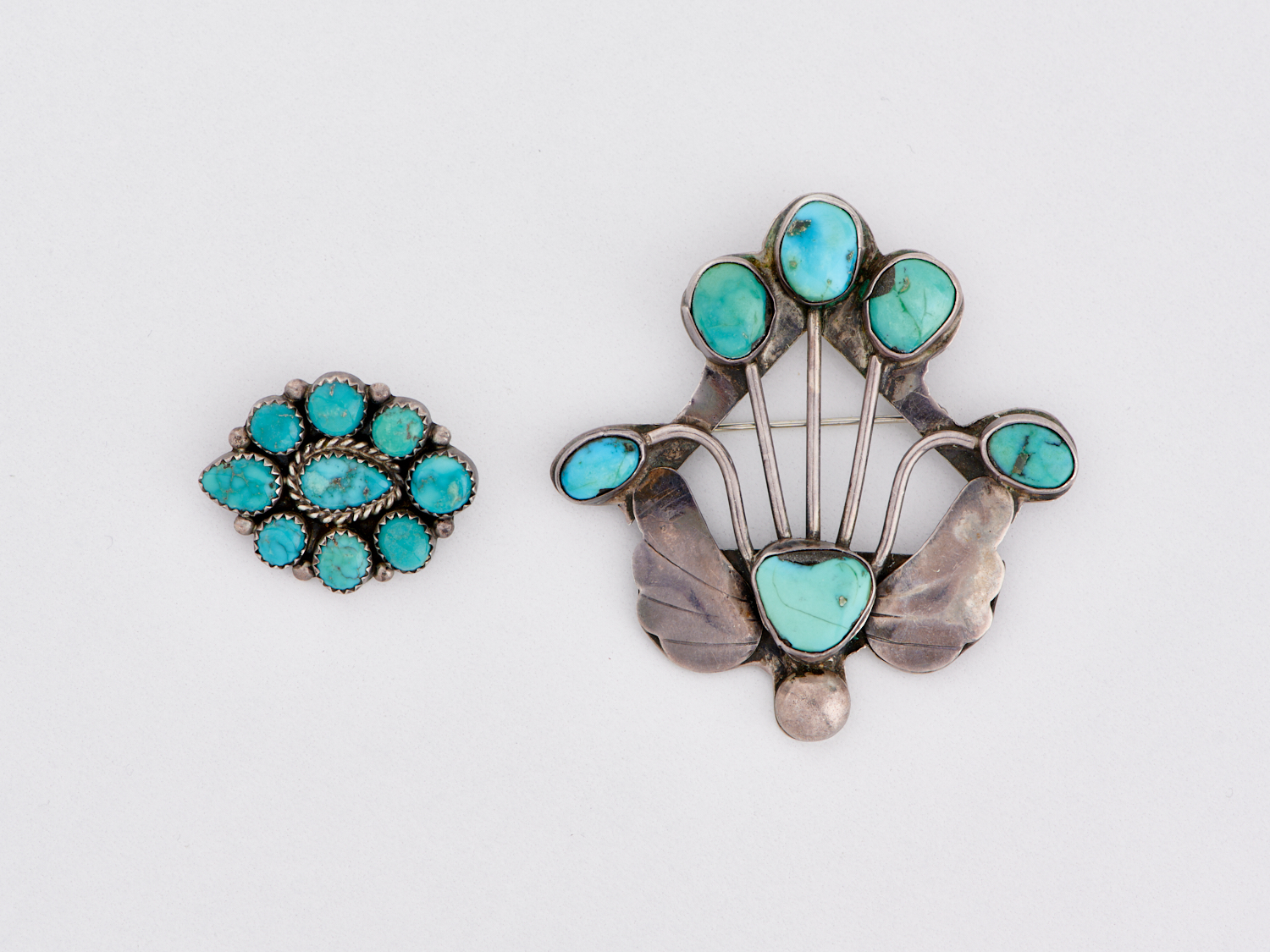 TWO VINTAGE TURQUOISE SET BROOCHES IN SILVER, 60 X 60MM AND 30 X 25MM