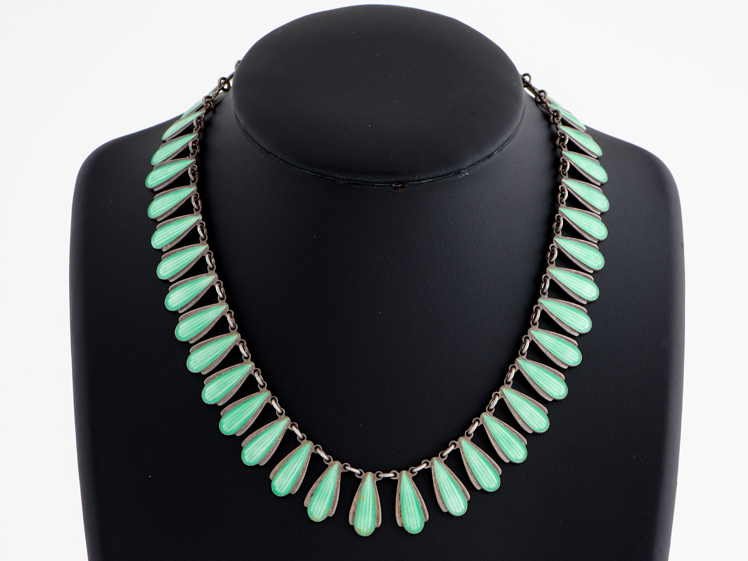 A VINTAGE SILVER AND ENAMEL FRINGE NECKLACE, STAMPED 'DENMARK', LENGTH 390MM.