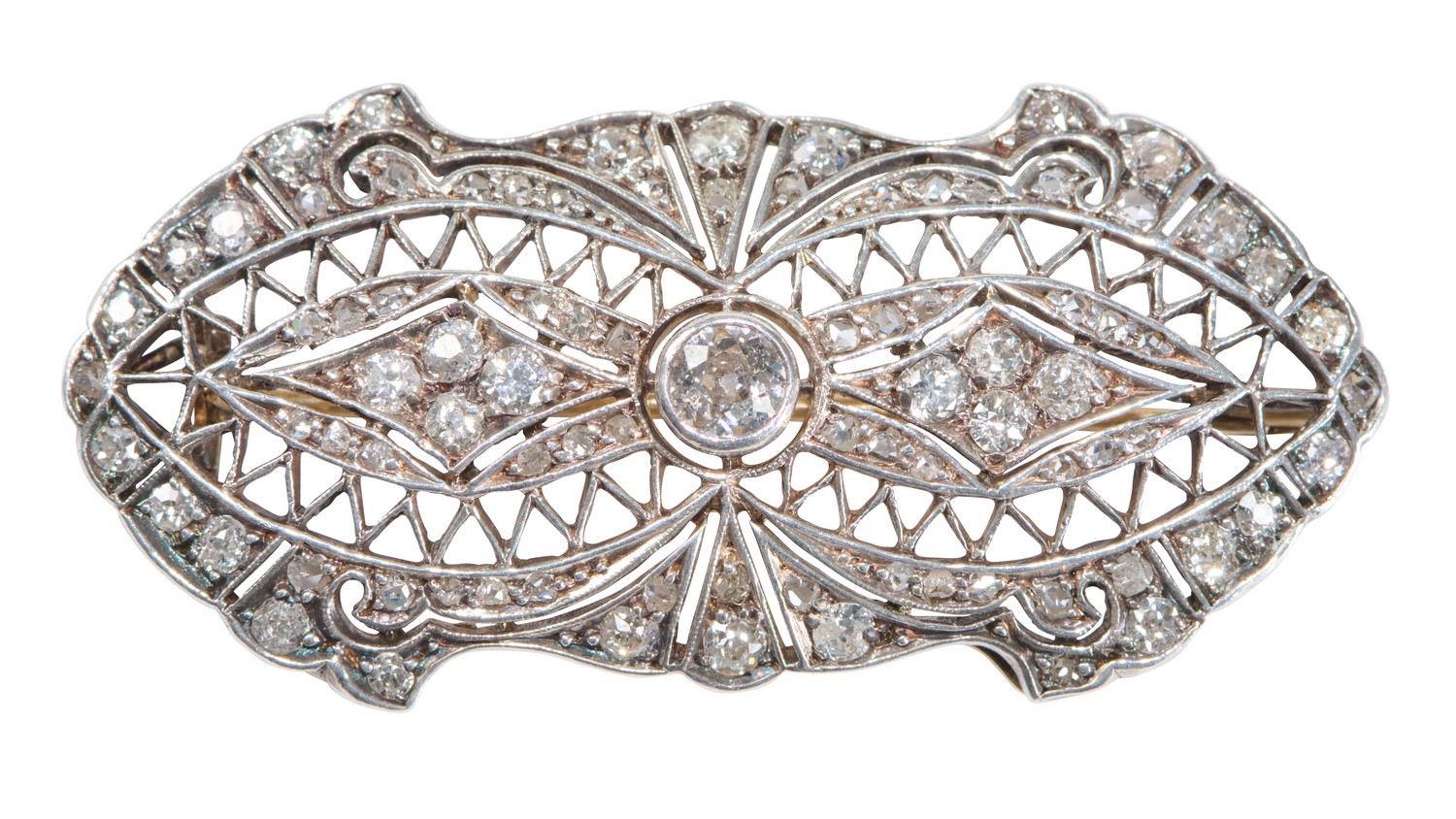 A DIAMOND SET BROOCH IN SILVER AND 14CT GOLD, CENTRING AN OLD EUROPEAN-CUT DIAMOND WEIGHING APPROXIMATELY 0.22 CARATS, WITHIN A PIERCED SURROUND DETAILED THROUGHOUT WITH FURTHER OLD-CUT DIAMONDS TOGETHER WEIGHING APPROXIMATELY 0.95 CARATS, LENGTH 46MM