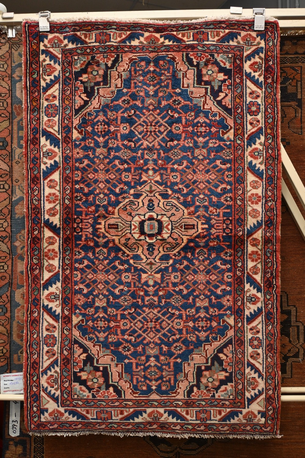 A PERSIAN HOSSAINABAD RUG. 100% WOOL, SOLID AND DENSE. HAND-KNOTTED VILLAGE WEAVE FROM THE HAMADAN REGION WITH A DESIGN OF CENTRAL FLORAL MEDALLION ON A NAVY-TONED FIELD OF HERATI MAHI PATTERNS. TRIBAL MOTIF PATTERNED BORDER. LOVELY MELLOW TONES. ORIGIN: PERSIA - RRP: $700 -SIZE: 128 X 80 CM DOCUMENTATION OF AUTHENTICITY INCLUDED.