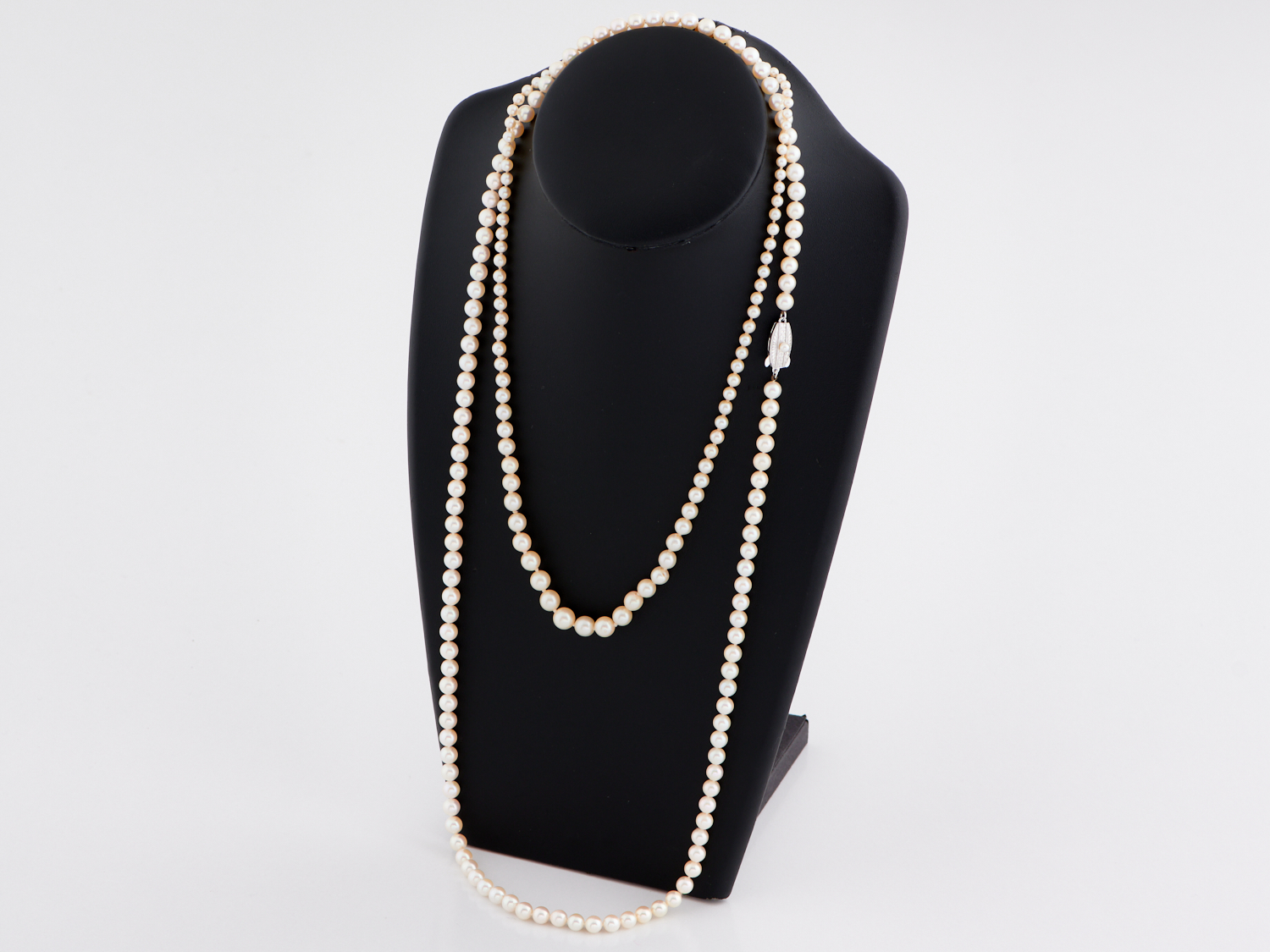TWO CULTURED PEARL NECKLACES ONE MIKIMOTO, PEARL DIAMETER 6.4MM, LENGTH 800MM, THE OTHER WITH GRADUATED PEARLS FROM 3.1 TO 7.7MM TO A BOX CLASP IN 14CT GOLD, LENGTH 550MM