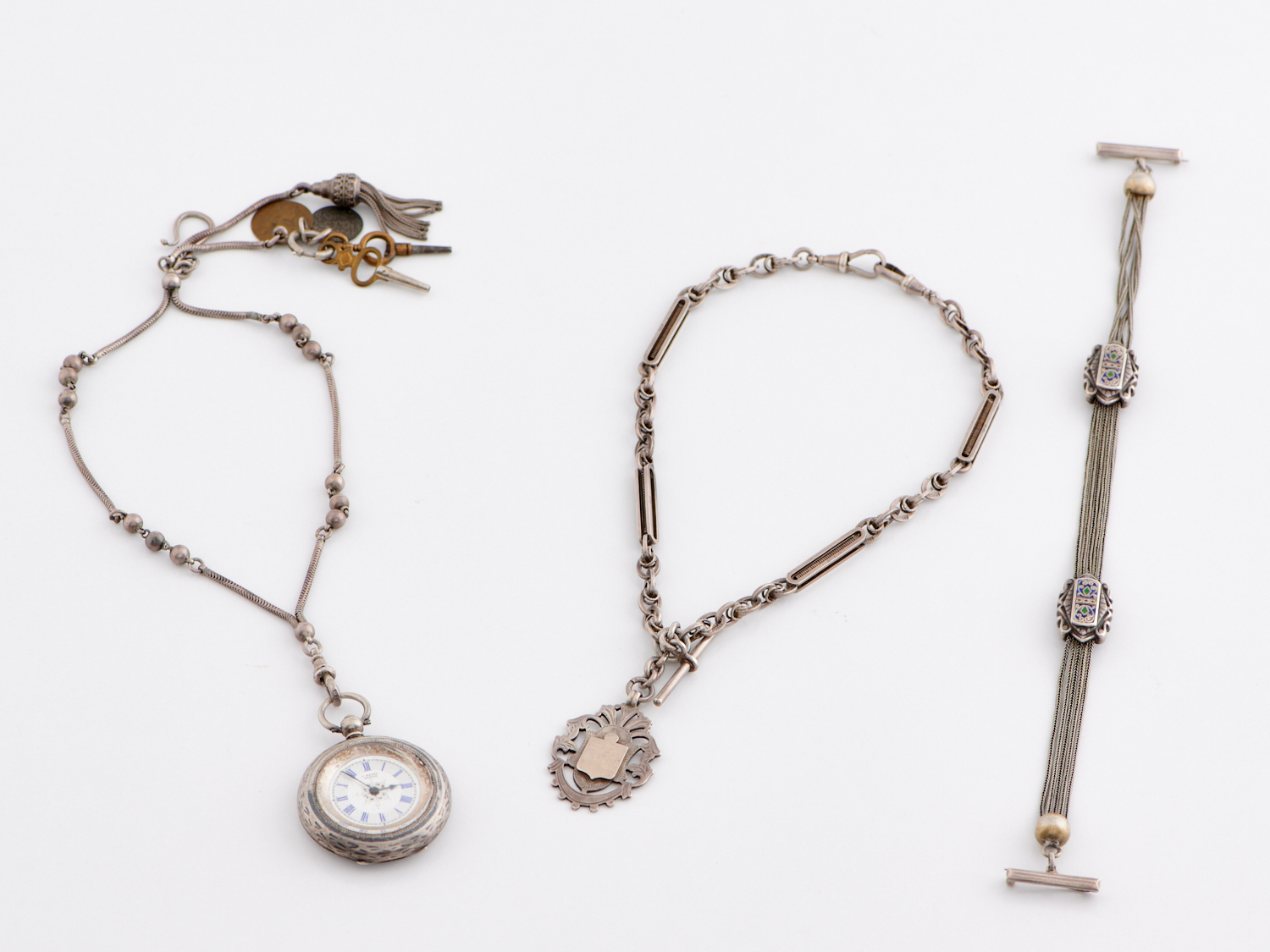 THREE SILVER FANCY ALBERTINA CHAINS IN SILVER AND ONE OPEN FACE POCKET WATCH, ONE ALBERTINA WITH BERMINHAM HALLMARKS