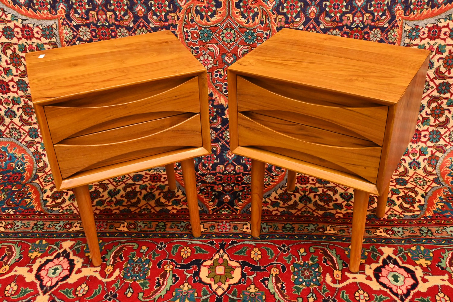 A PAIR OF SCANDI STYLE TEAK BEDSIDE TABLES ( 56H X 41W X 32D CM) (LEONARD JOEL DELIVERY SIZE: LARGE)