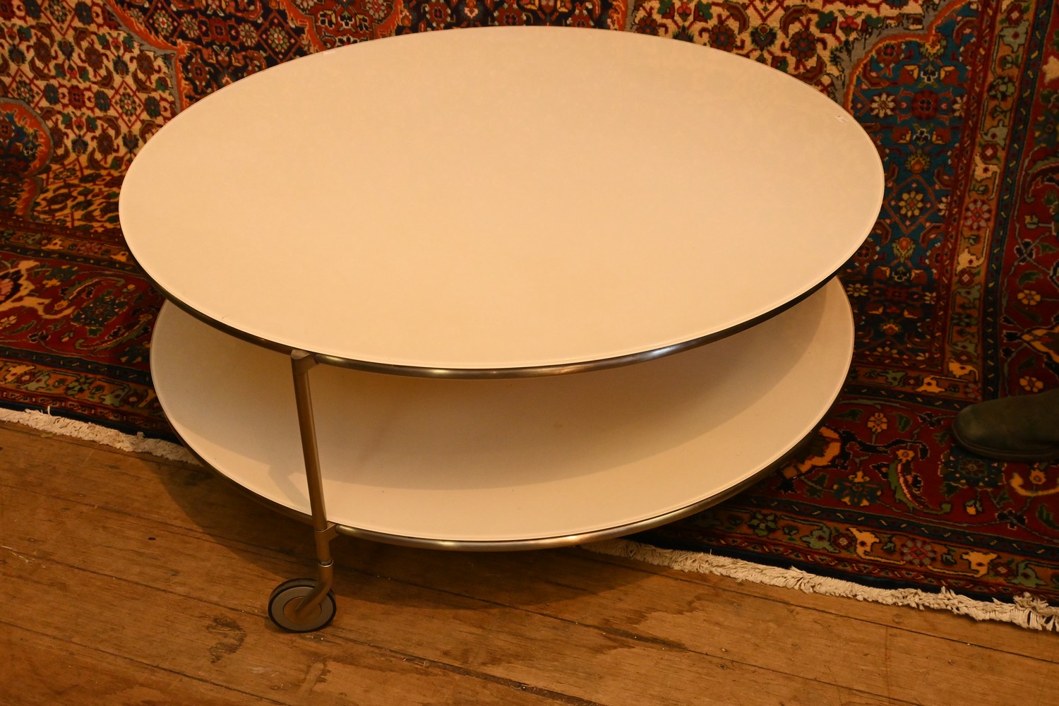 A TWO TIER GLASS & METAL COFFEE TABLE (A/F) ( 40H X 100 DIAMETER CM) (LEONARD JOEL DELIVERY SIZE: X-LARGE)