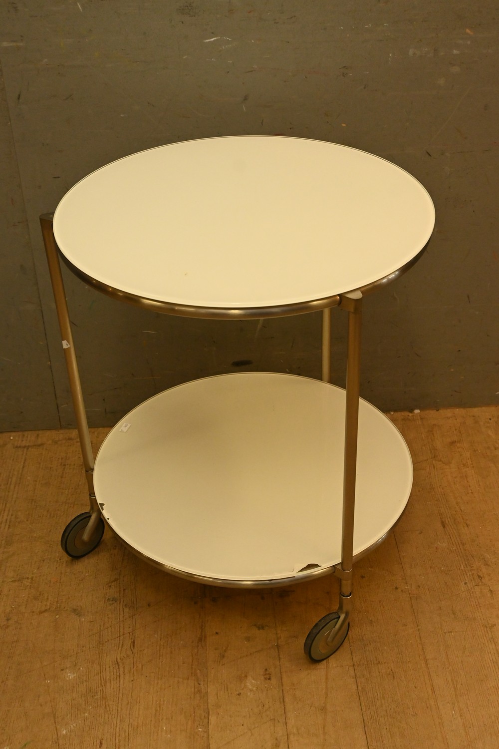 A PETITE TWO TIER GLASS & METAL COFFEE TABLE ON CASTORS (A/F) ( 61H X 54 DIAMETER CM) (LEONARD JOEL DELIVERY SIZE: LARGE)