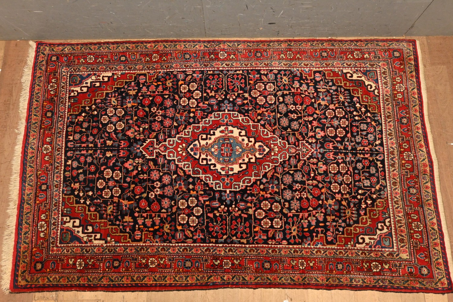 A PERSIAN KASHAN RUG WITH CENTRAL MEDALLION DESIGN ON A RED & BLUE FIELD (A/F) ( 216 X 132W CM) (LEONARD JOEL DELIVERY SIZE: X-LARGE)