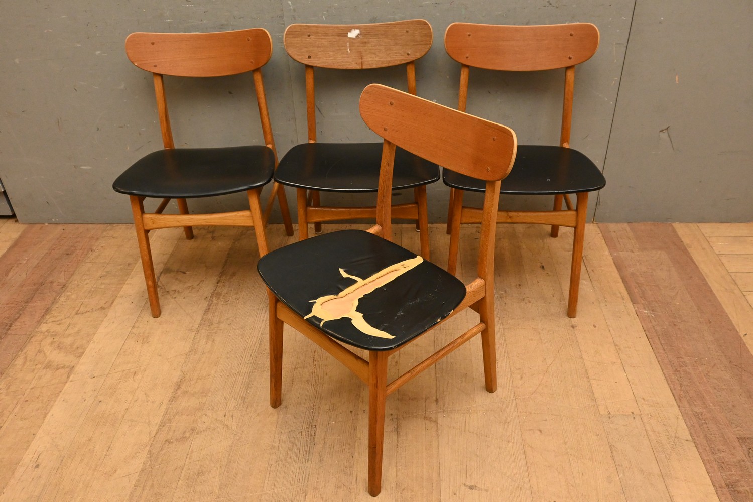 A SET OF FOUR SOLID OAK DANISH MID CENTURY DINING CHAIRS (A/F) (78H X 46W X 45D CM) (LEONARD JOEL DELIVERY SIZE: LARGE)