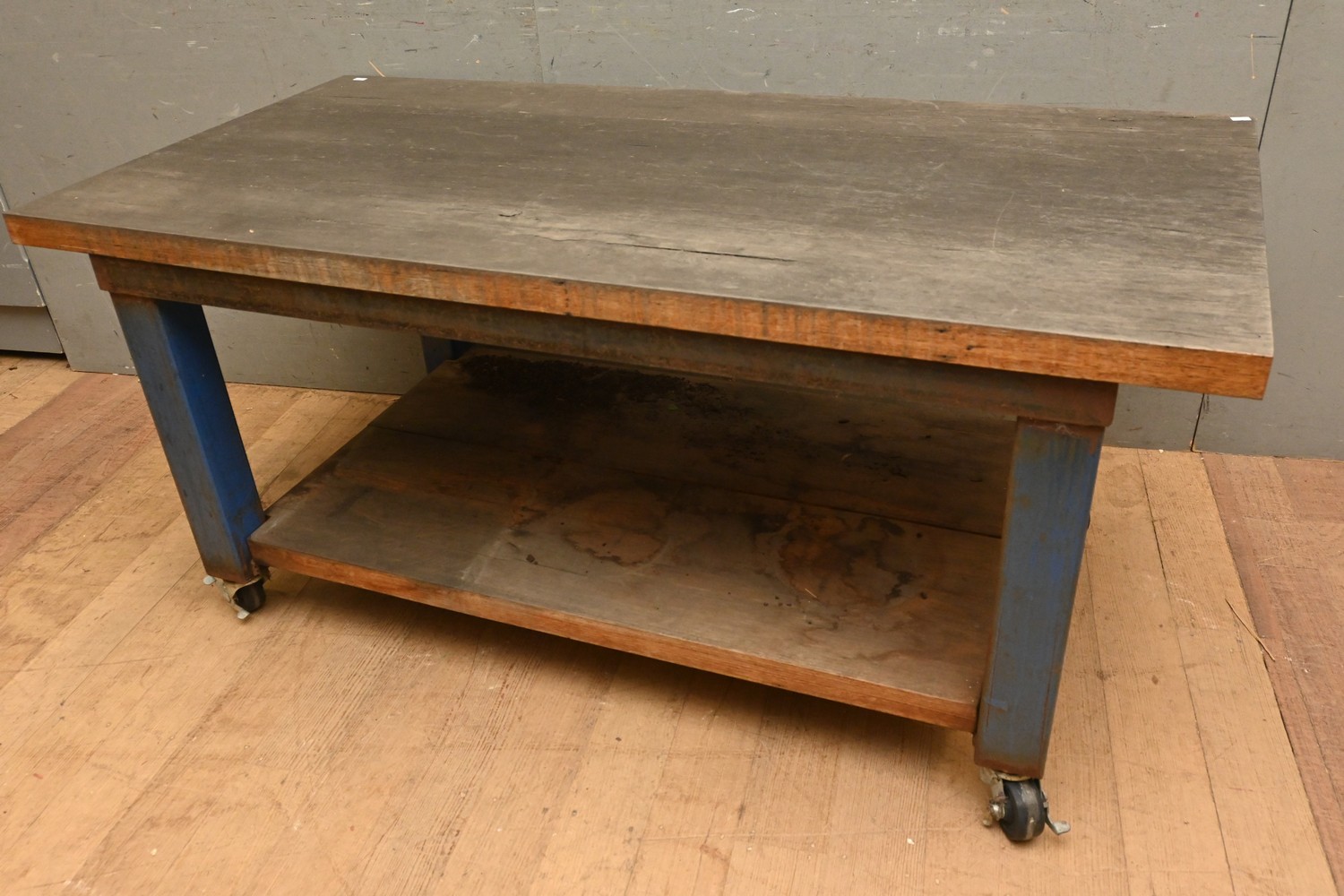 AN INDUSTRIAL TWO TIER WORKBENCH ON CASTORS (A/F) ( 64H X 142W X 70DCM) (THIS HEAVY ITEM MUST BE REMOVED BY CLIENTS OR CARRIERS AT THE CUSTOMERS EXPENSE. LEONARD JOEL STAFF CANNOT ASSIST CARRYING THIS ITEM)
