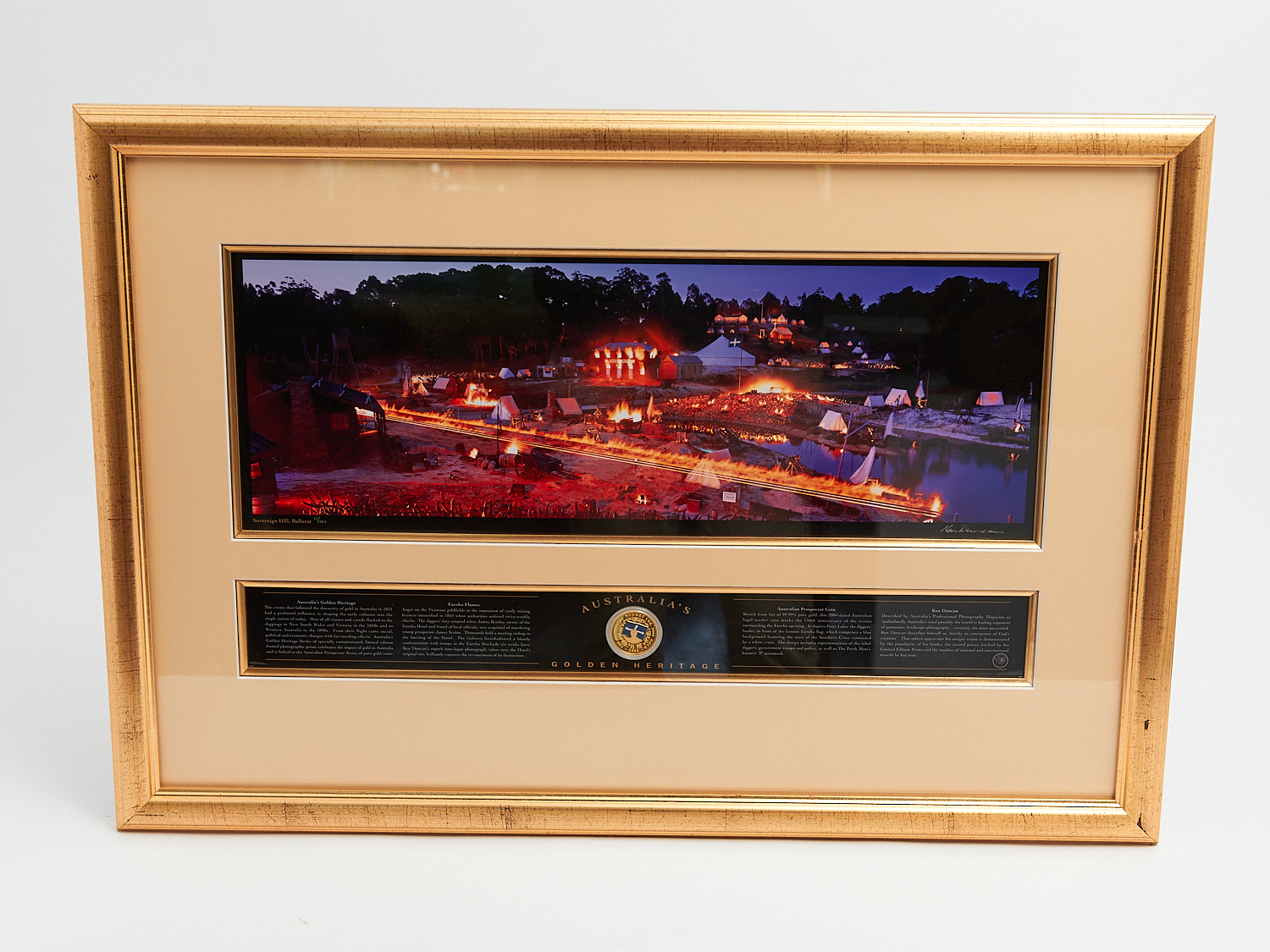 AN AUSTRALIA'S GOLDEN HERITAGE LIMITED EDITION PHOTOGRAPHIC FRAMED PRINT "SOVEREIGN HILL, BALLARAT" 11/100 BY KEN DUNCAN, INCLUDING "THE AUSTRALIAN NUGGET" 1OZ .9999 GOLD COIN, 2001 H.48.5CM X W.70CM, LEONARD JOEL LOCAL DELIVERY: MEDIUM