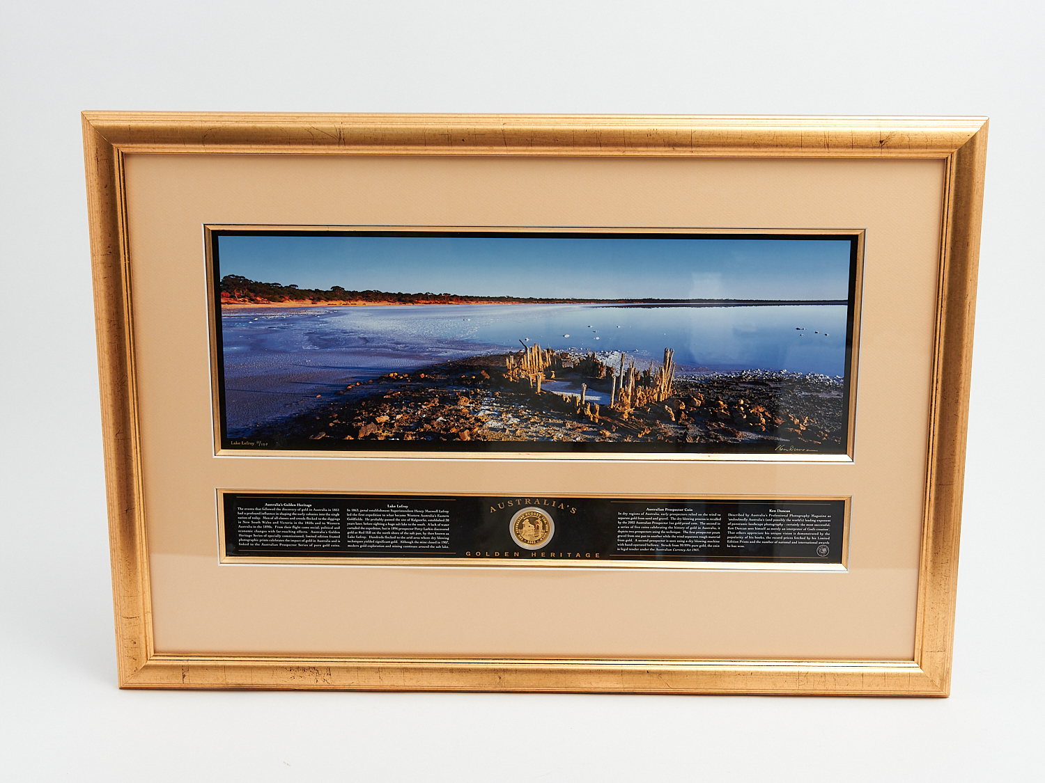 AN AUSTRALIA'S GOLDEN HERITAGE LIMITED EDITION PHOTOGRAPHIC FRAMED PRINT "LAKE LEFROY" 11/100 BY KEN DUNCAN, INCLUDING "THE AUSTRALIAN NUGGET" 1OZ .9999 GOLD COIN, 2001 H.48.5CM X W.70CM, LEONARD JOEL LOCAL DELIVERY: MEDIUM