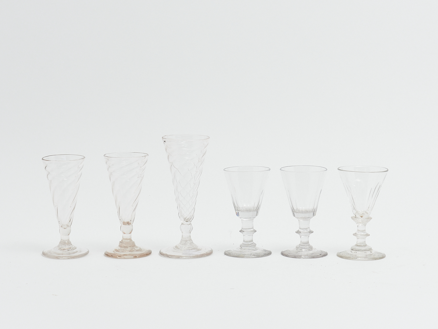 SIX 19TH-CENTURY GLASSES INCLUDING THREE CONICAL TWIST ALE GLASSES, H.15CM (TALLEST), LEONARD JOEL LOCAL DELIVERY: SMALL