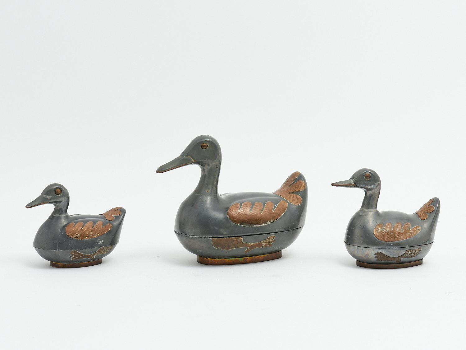A GRADUATED SET OF THREE PEWTER AND BRASS DUCK FORM CONTAINERS, L.20CM (LARGEST), LEONARD JOEL LOCAL DELIVERY: SMALL