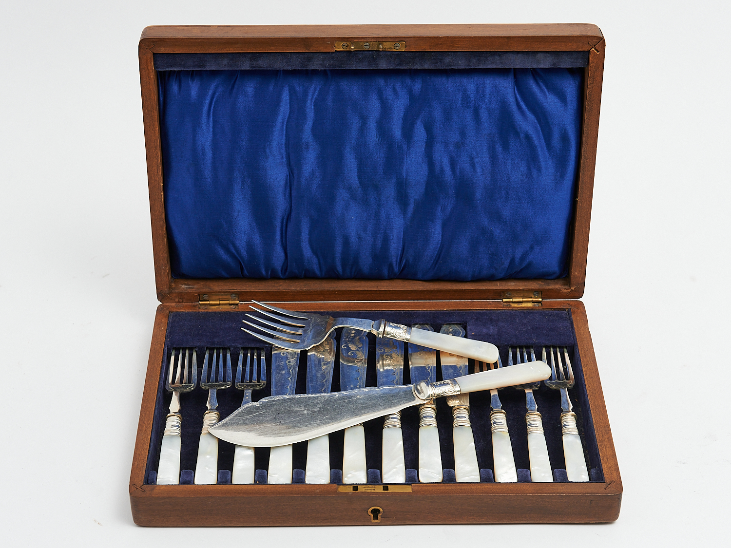 A SET OF ENGLISH OAK CASED MOTHER OF PEARL HANDLED FISH CUTLERY TOGETHER WITH TWO FISH SERVERS, LEONARD JOEL LOCAL DELIVERY: MEDIUM