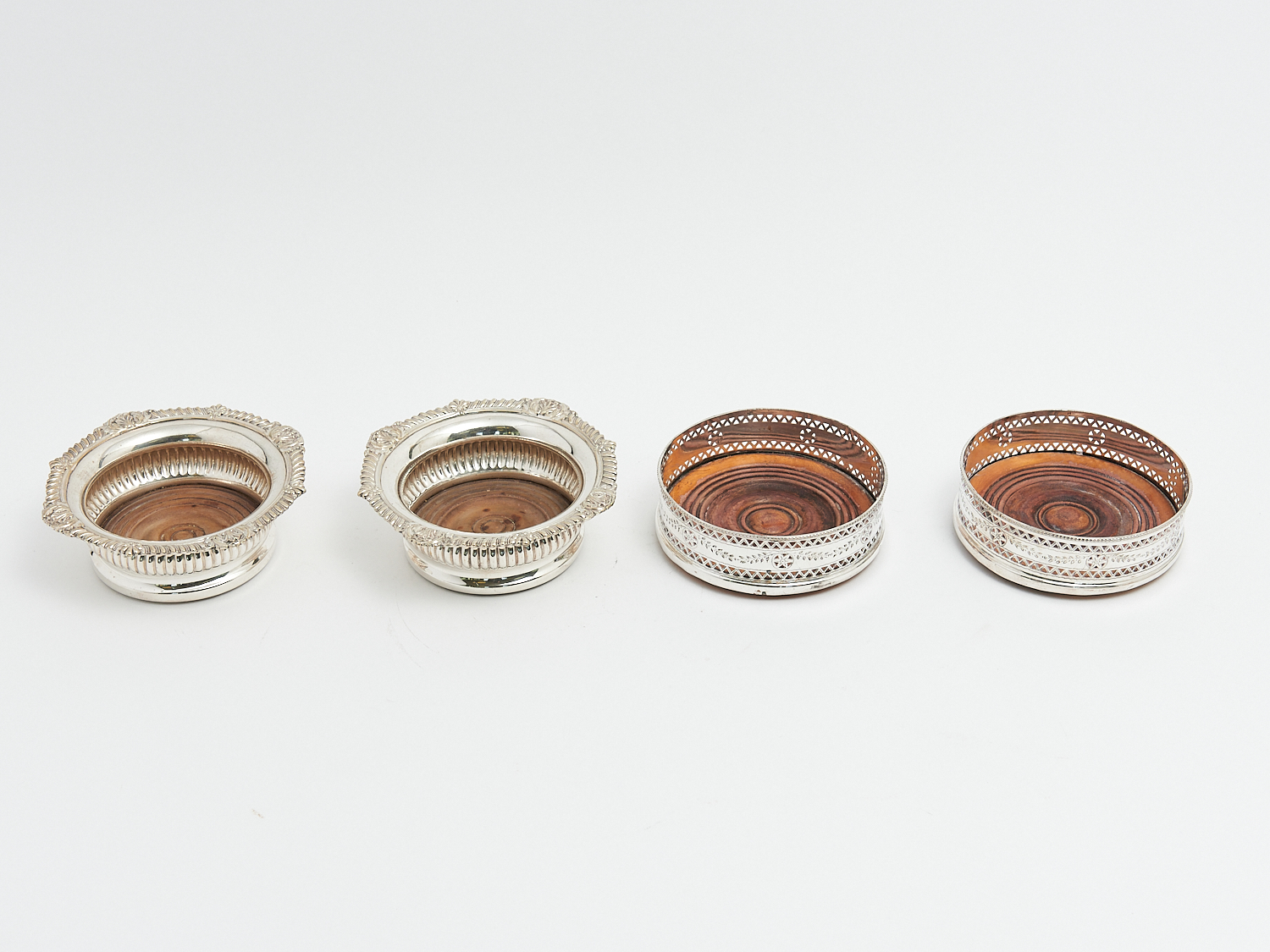 TWO PAIRS OF SHEFFIELD SILVER PLATE WOODEN BASED BOTTLE COASTERS, DIA.16.5CM (LARGEST), LEONARD JOEL LOCAL DELIVERY: SMALL