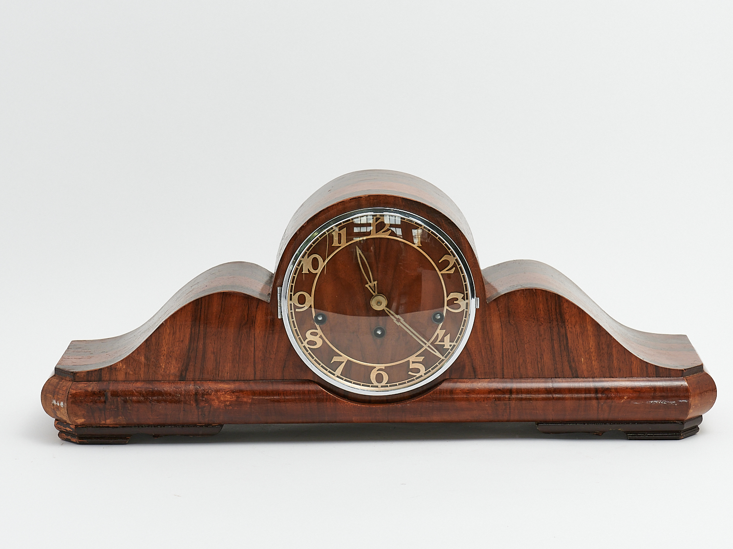 AN ART DECO MANTLE CLOCK WITH CIRCULAR CHROME DIAL, KEY AND PENDULUM PRESENT, L.63CM, LEONARD JOEL LOCAL DELIVERY: MEDIUM