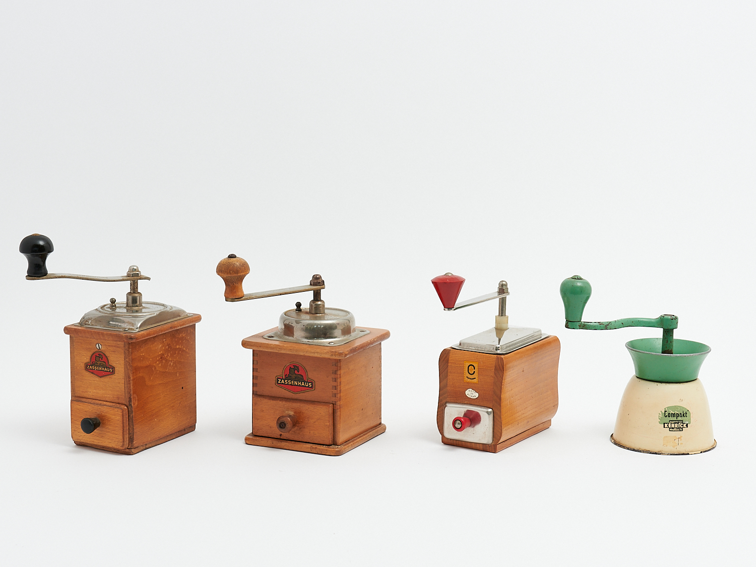 FOUR VINTAGE COFFEE GRINDERS, H.22CM (TALLEST), LEONARD JOEL LOCAL DELIVERY: SMALL