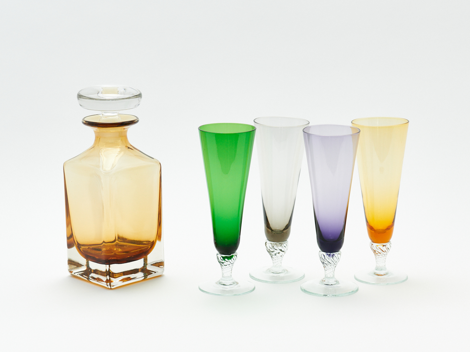 A SQUARE FORM DECANTER AND FOUR CONICAL GLASSES, H.23CM, LEONARD JOEL HOME DELIVERY SIZE: MEDIUM