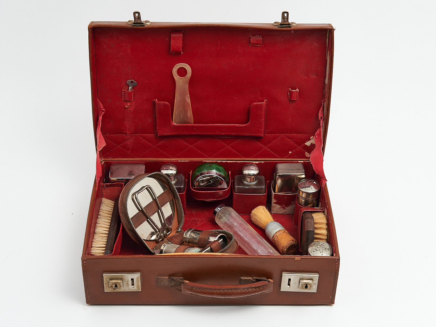 A VINTAGE LEATHER CASED TRAVELLING TOILETRIES SET WITH PAPER SHIPPING LABEL, H.11CM X W.39CM X D.25CM, LEONARD JOEL LOCAL DELIVERY: MEDIUM