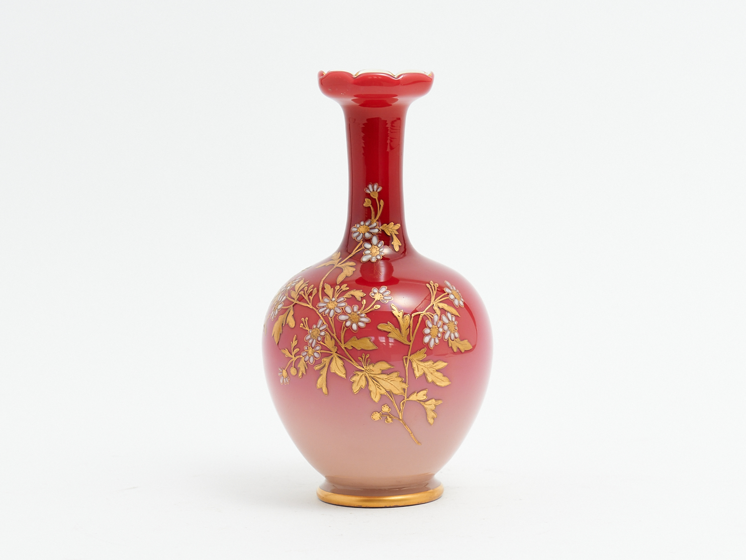 A BOHEMIAN PEACH GLASS ENAMEL DECORATED VASE, H.19.5CM, LEONARD JOEL LOCAL DELIVERY: SMALL