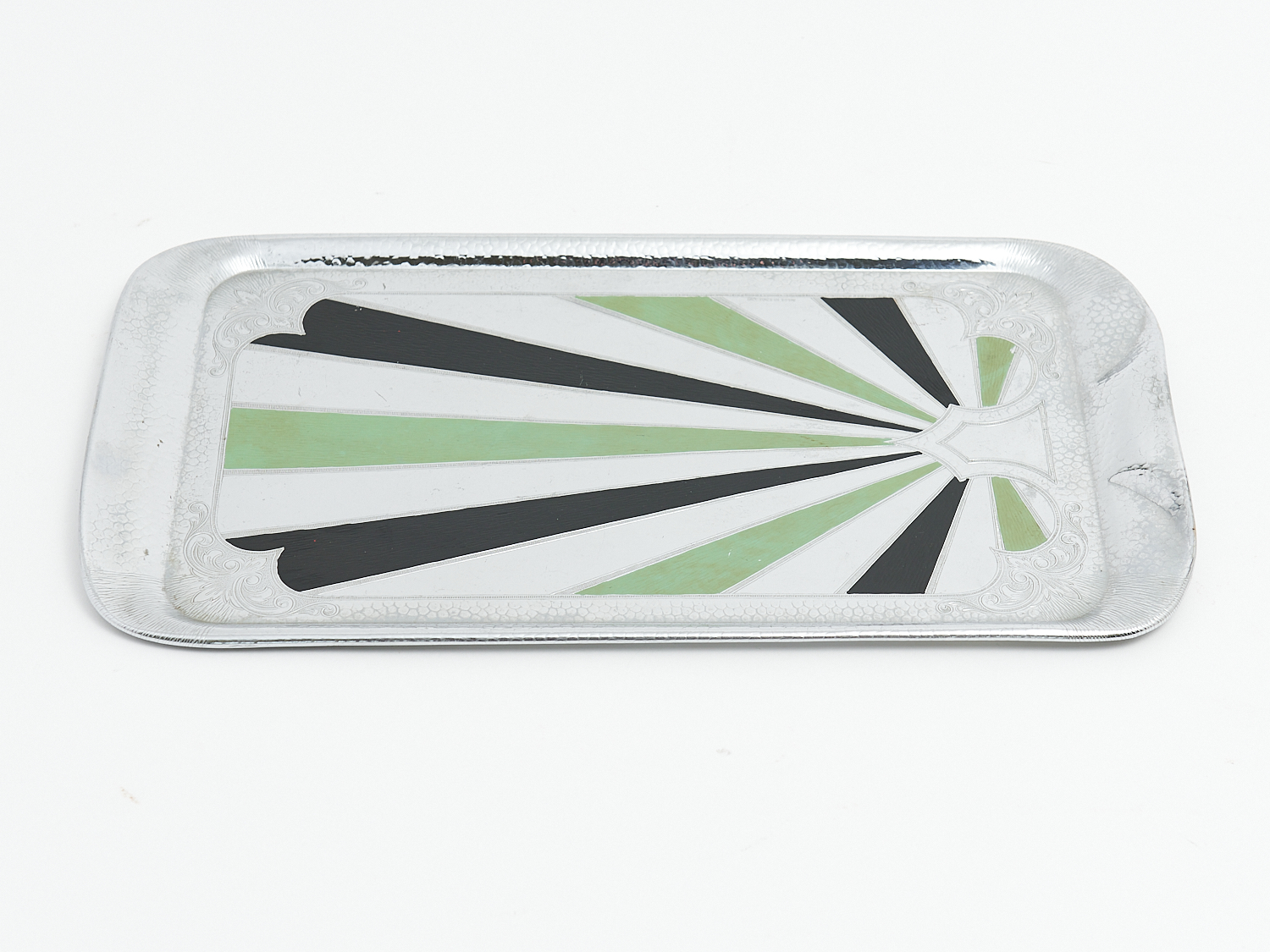 AN ENAMEL DECORATED CHROMED METAL TRAY, L.39 X W.22CM, LEONARD JOEL LOCAL DELIVERY: SMALL