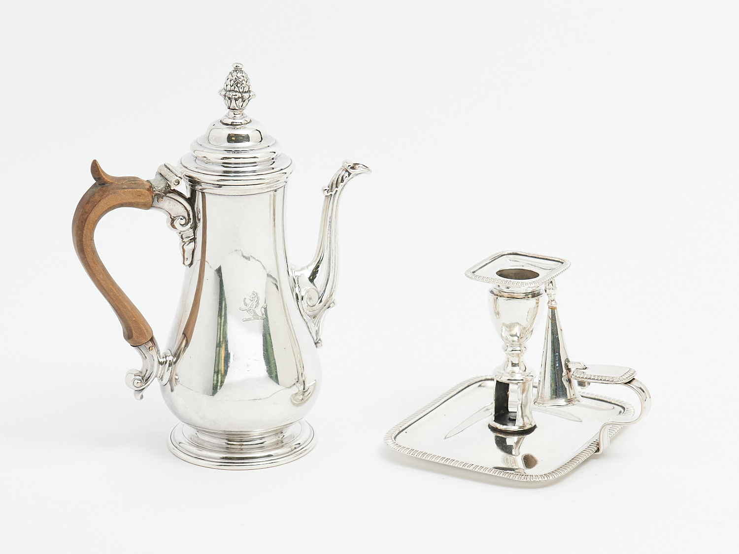 A GEORGIAN CRESTED SHEFFIELD PLATE WOODEN HANDLED COFFEEPOT AND GEORGIAN SHEFFIELD PLATE CANDLESTICK WITH SNUFFER, H.23CM, LEONARD JOEL LOCAL DELIVERY: SMALL