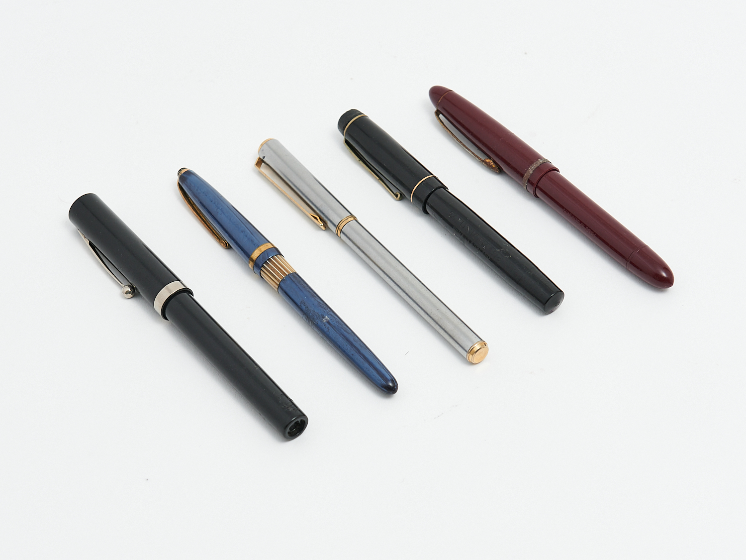 A GROUP OF FIVE VINTAGE FOUNTAIN PENS INCLUDING METAL AND CELLULOID, LEONARD JOEL LOCAL DELIVERY: SMALL